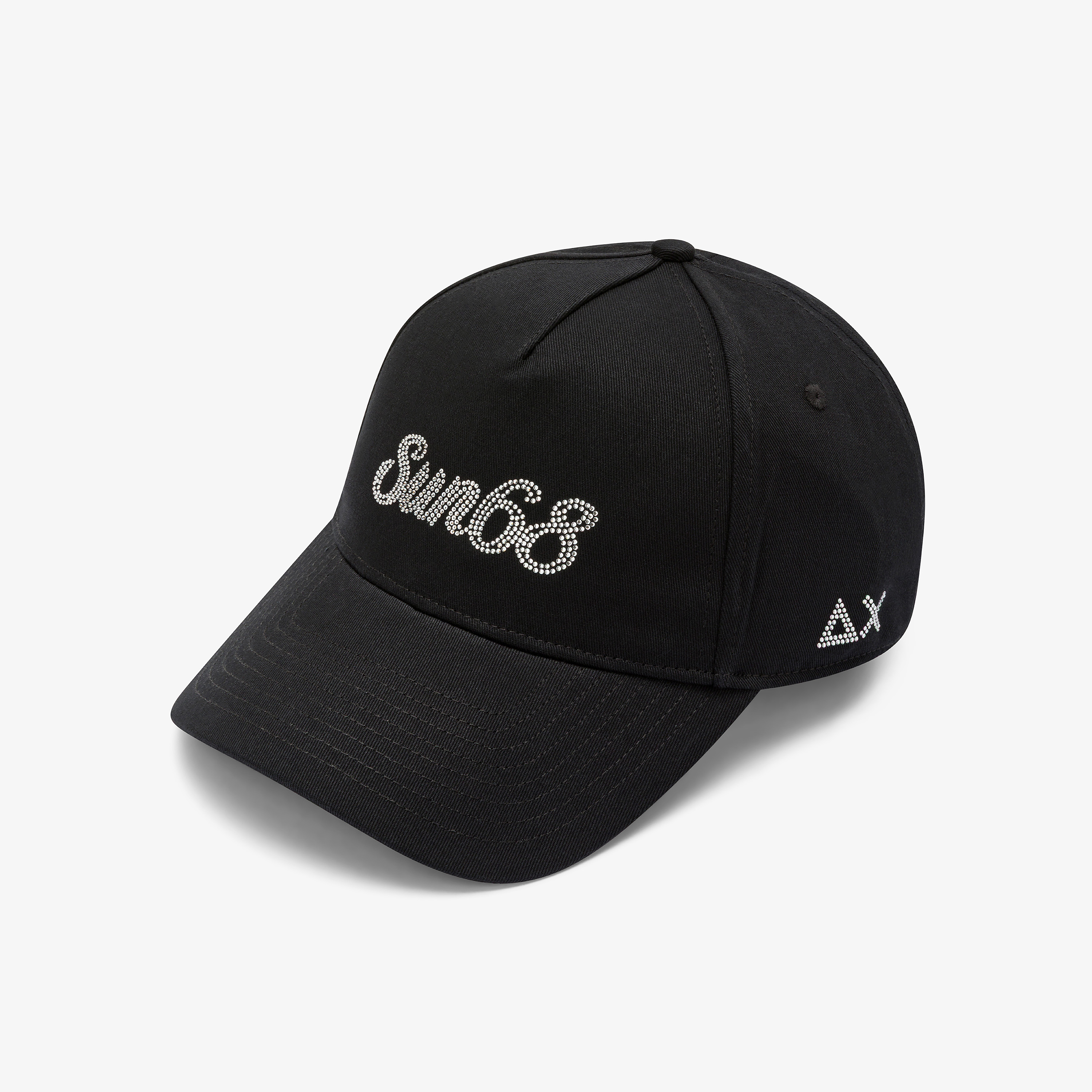 The SUN68 baseball cap is designed to offer protection and style for outdoor activities. Made from pure cotton, it features rhinestone logo details that add a bright touch of glamour to the design. It's a versatile accessory that pairs naturally with the matching pouch and sliders from the collection.