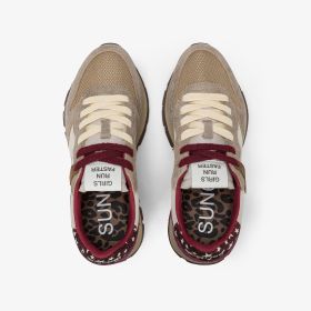 Design classico dall'estetica autentica. La sneaker Ally Vintage si ispira all'icona SUN68 e la reinterpreta con un ricercato effetto used, lo spoiler in suede animalier e il lettering "Run faster" che decora la suola.