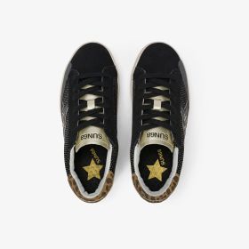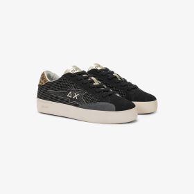 La versione SUN68 della classica tennis shoe da ragazza. Il modello Katy Animalier è proposto con dettagli maculati e la maxi patch a forma di stella con logo ricamato.